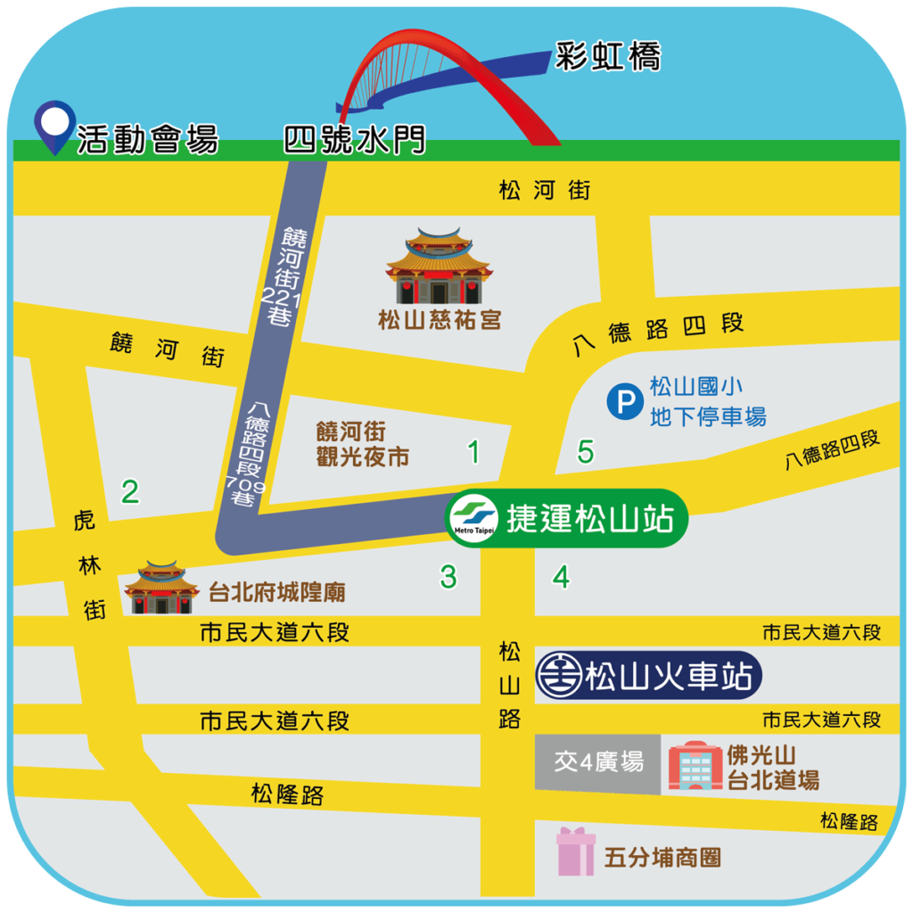 松山車站出站後往松河街方向,約 350 公尺,步行約 5 分鐘,經基隆河四號疏散門即可抵達會場。